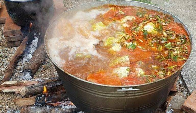 El guacasiscaldu se elabora a base de carne de res, repollo, tomate, cebolla de cola, garbanzo y se acompaña de tortillas hechas en mano de maíz amarillo que después de sacarlas del comal se colocan en un tarro y se tapan con mantas para conservar el caliente del fuego en espera de los comensales.